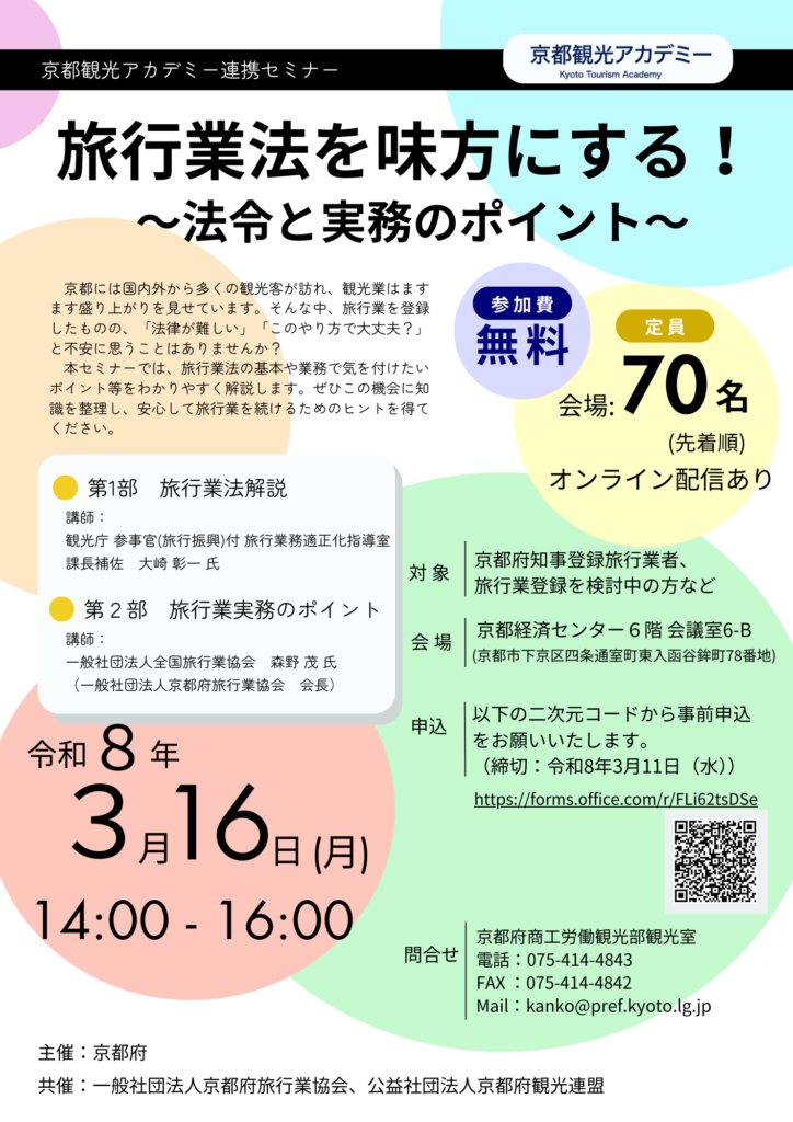 本セミナーでは、旅行業法の基本や業務で気を付けたいポイント等をわかりやすく解説します。ぜひこの機会に知識を整理し、安心して旅行業を続けるためのヒントを得てください。