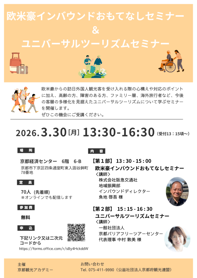本セミナーでは、欧米豪からの訪日外国人観光客を受け入れる際の心構えやコツと今後、客層の多様化が進むことを踏まえたユニバーサルツーリズムについて学ぶセミナーを開催します。是非この機会にセミナーを御受講ください。 日時 令和 […] -