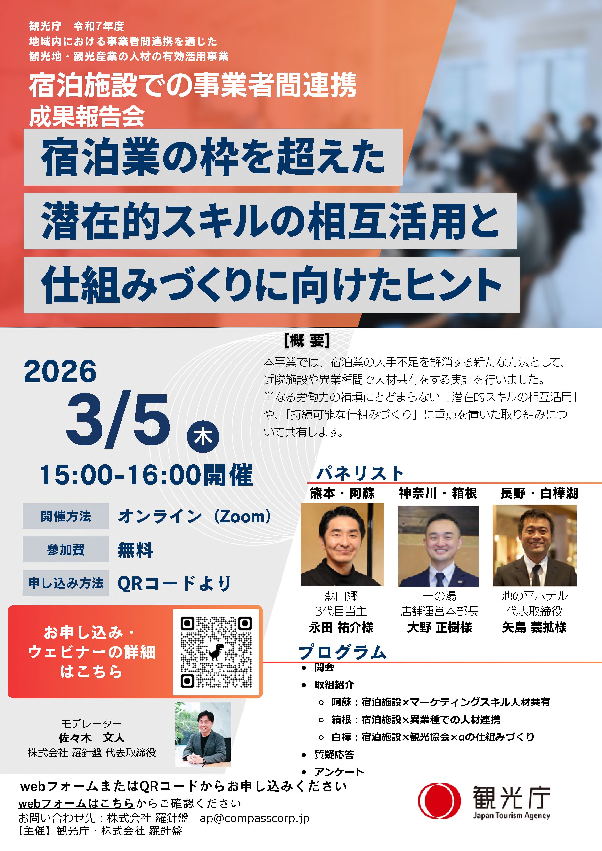 宿泊事業者の皆様をはじめ、関係者の皆様(地方公共団体の観光・商工部門担当者、DMO・観光協会、観光関連事業者等)、ご関心のある全ての方のご参加をお待ちしております。
