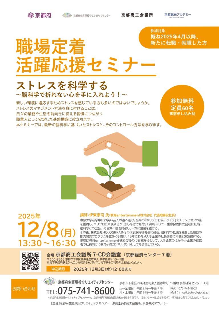 京都府生涯現役クリエイティブセンターでは、京都商工会議所、京都観光アカデミーと連携して、新入社員が職場に定着し、現場で活躍するための「職場定着活躍応援セミナー」を令和7年12月8日(月)に開催します。 ※詳細はこちらをご […] -