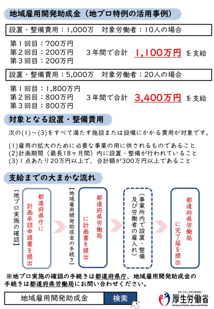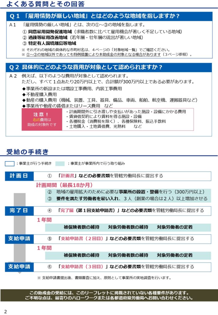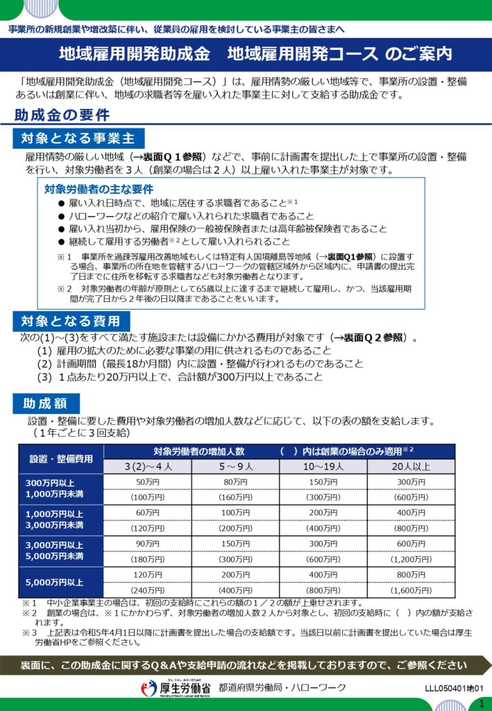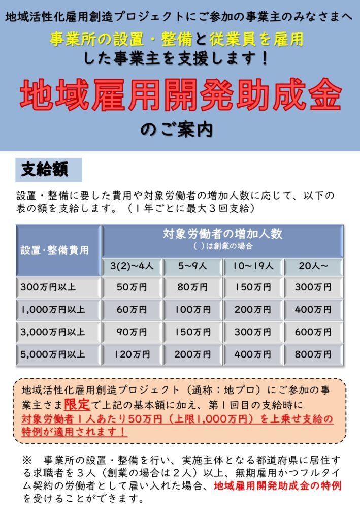雇用機会が特に不足している地域等(※1、2)の事業主が、事業所の設置・整備を行い、併せてその地域に居住する求職者等を雇い入れる場合、設置整備費用及び対象労働者の増加数に応じて助成されます。(1年毎に最大3回支給)